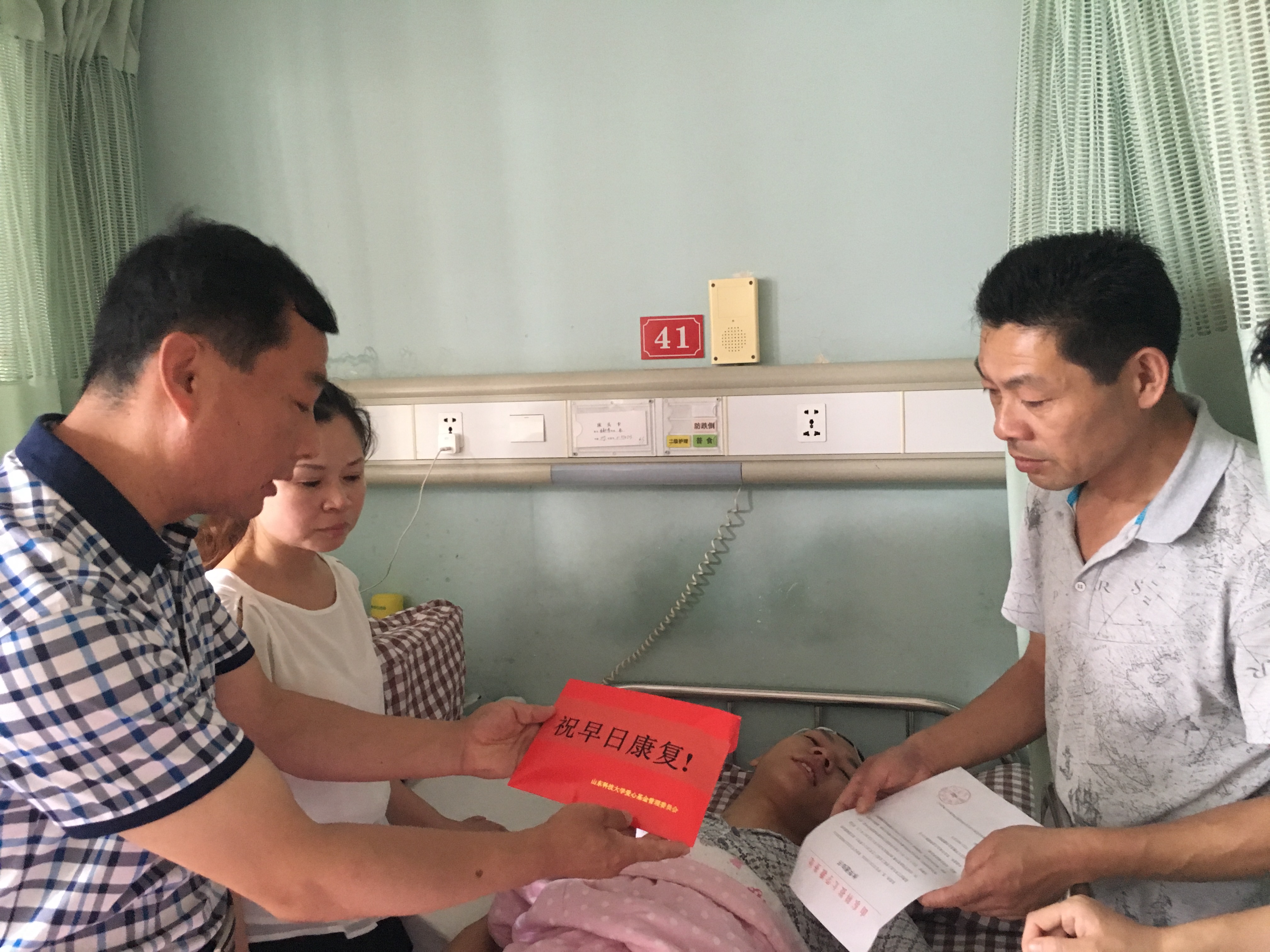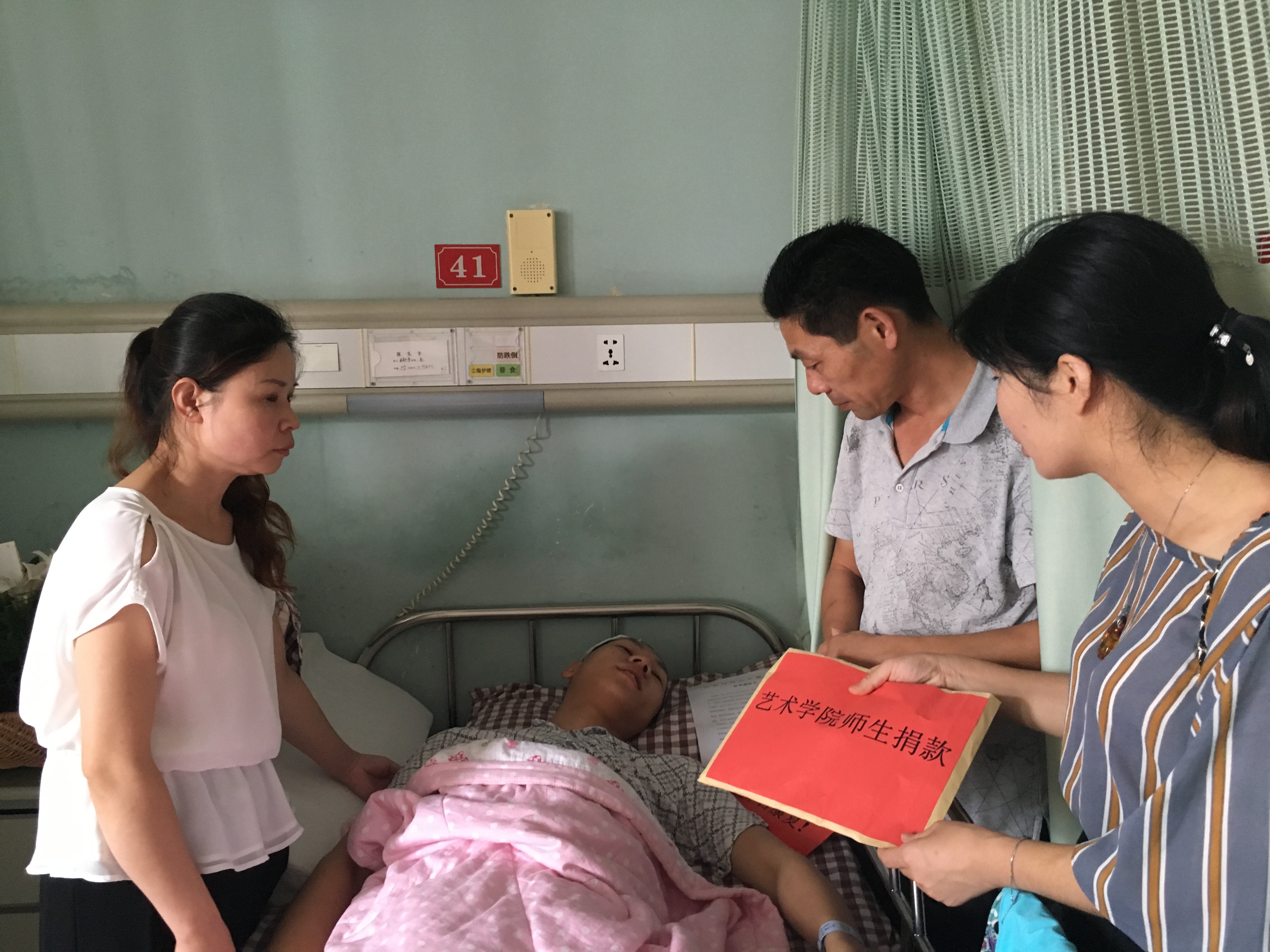 7月7日,艺术学院党委副书记兼副院长卫雪、校工会干部李建清、艺术学院辅导员杜婉君前往上海伽玛医院,看望患病学生朱勋涛,并送上校工会、校团委、艺术学院募集的5万余元善款。
