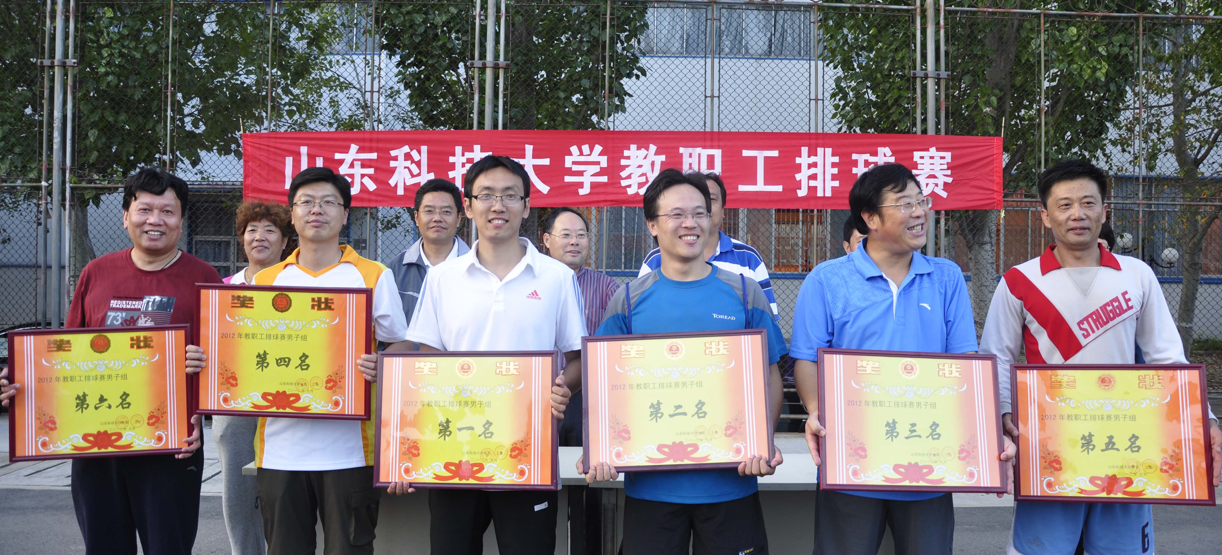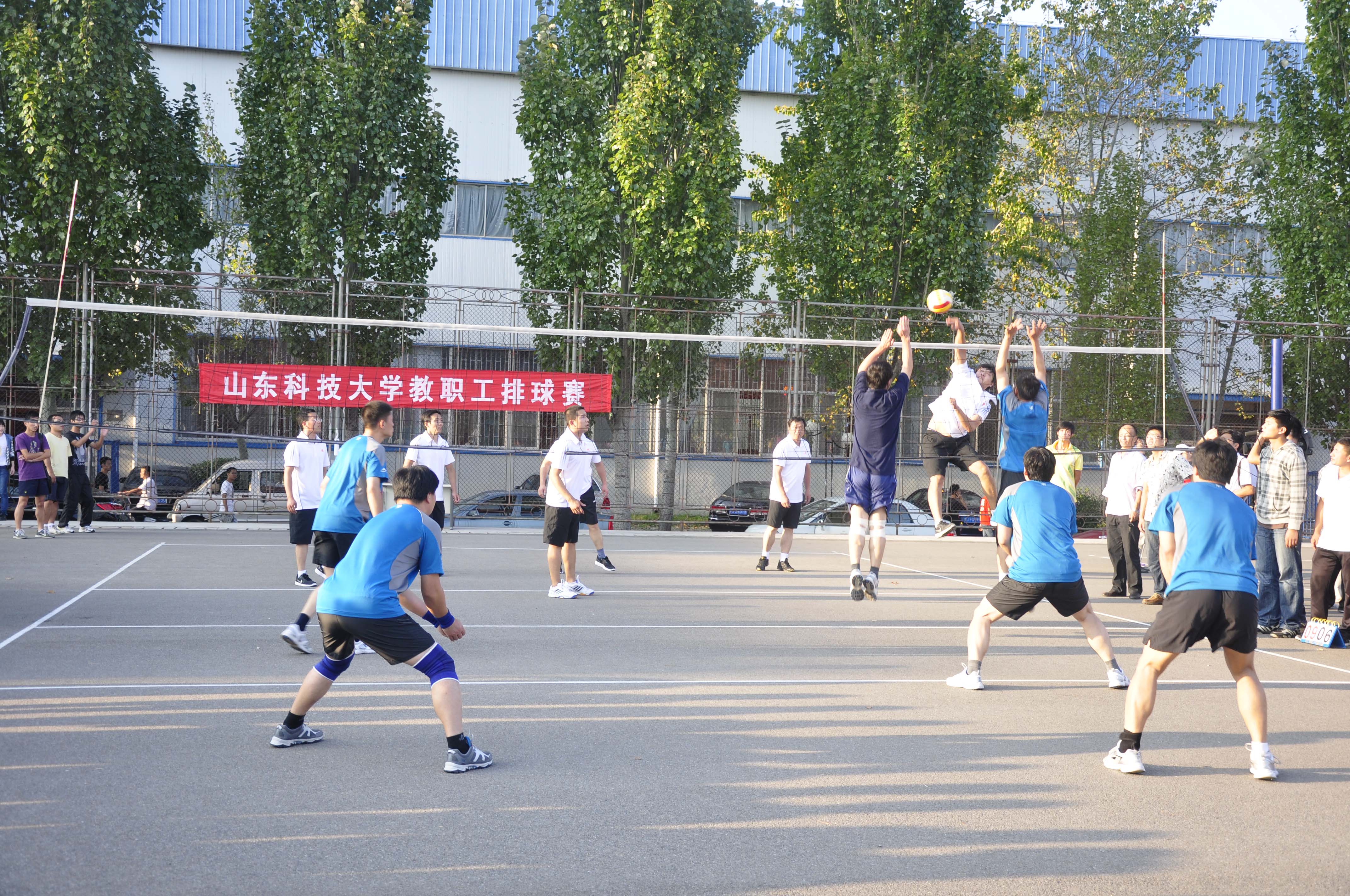 男子排球赛经过43场激烈角逐,后勤服务总公司蝉联比赛桂冠,外语学院、理学院、材料学院、机关、经管学院分列二至六名。