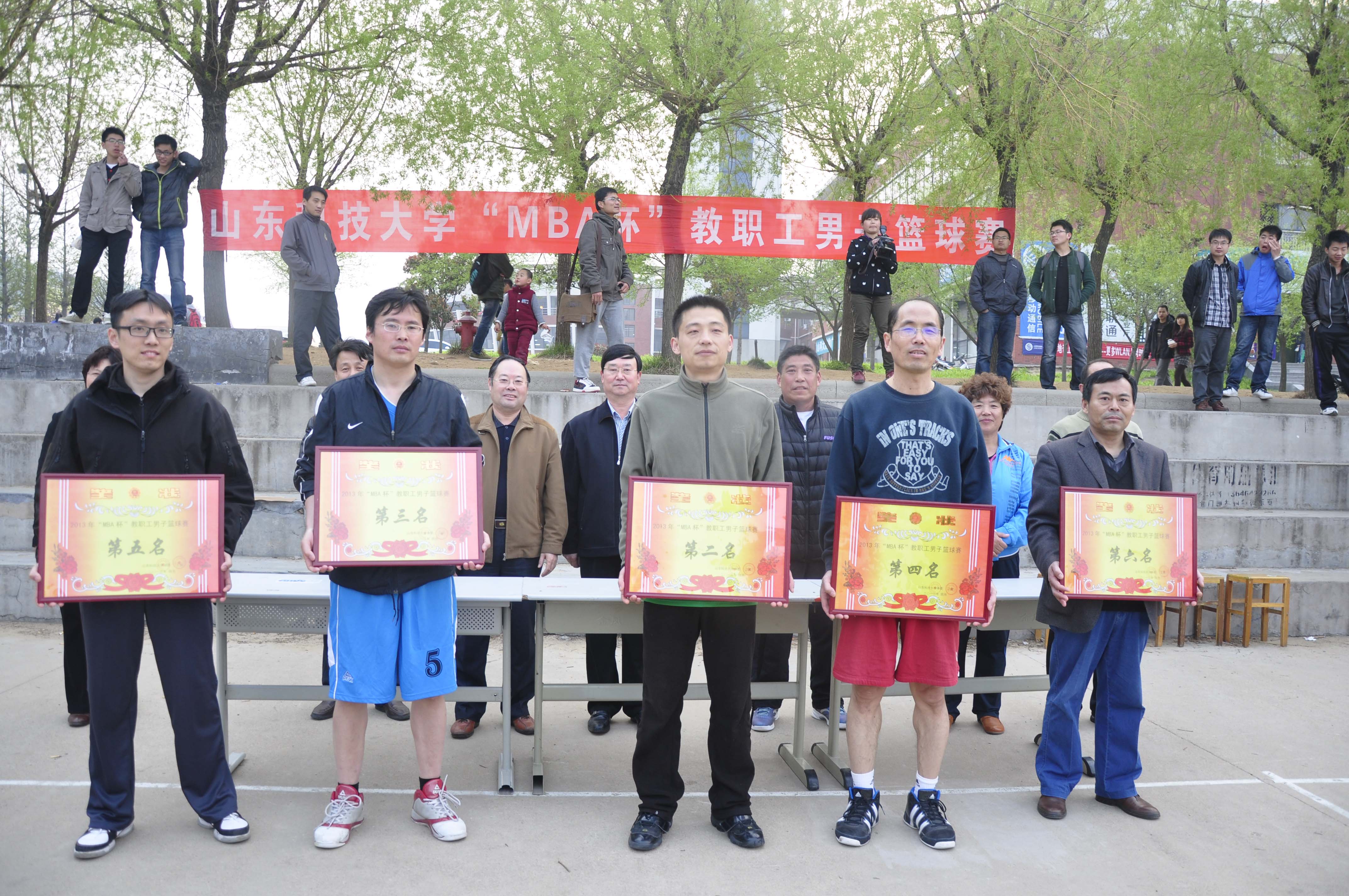 4月24日,2013年“MBA杯”教职工篮球赛在砚湖南侧篮球场落下帷幕。校党委副书记李武修、校工会主席高飞出席闭幕式并为获奖代表队颁奖。